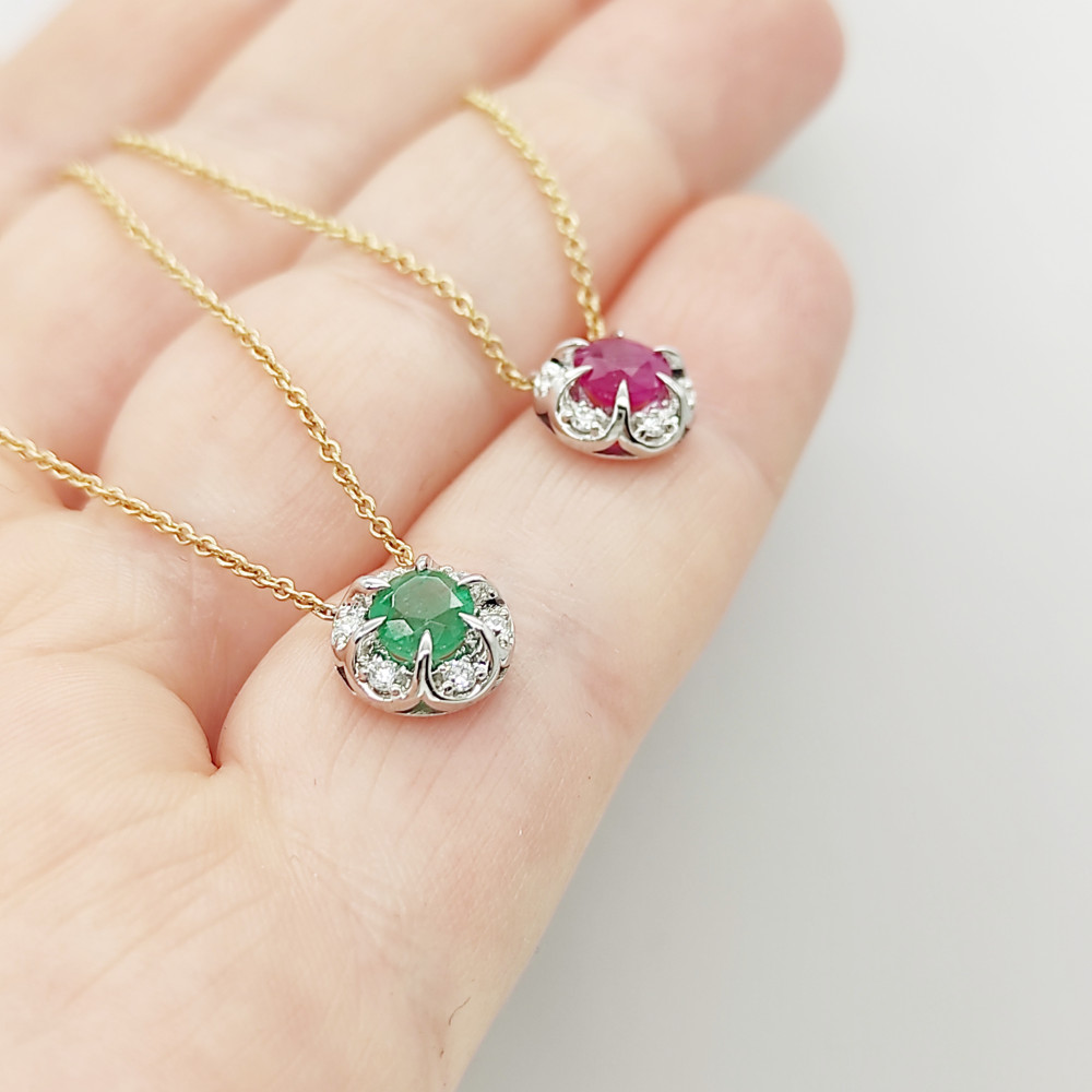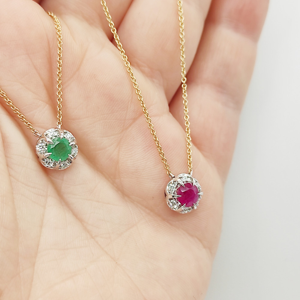 A kollekcióban a gyémántok diszkrét ragyogását élénk drágakövek teszik még izgalmasabbá: hol egy mélyzöld smaragd, hol egy bársonyos rubin vagy titokzatos tanzanit kölcsönöz egyedülálló karaktert a nyakláncnak. Minden felhasznált kő etikus forrásból származik, hiszen számunkra az érték nem csupán a szépségben rejlik, hanem abban is, hogy nyugodt szívvel viselhetők.