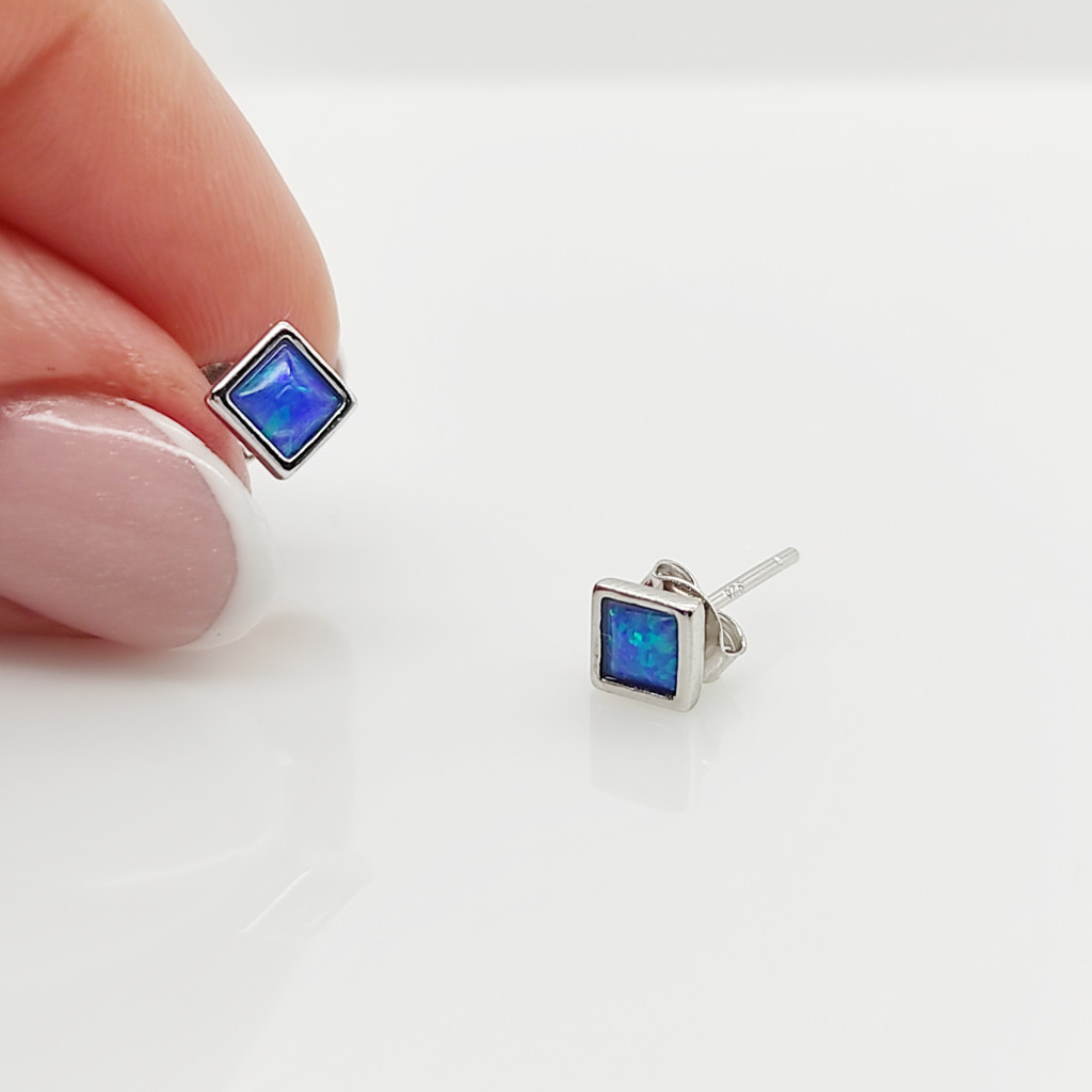 Ezüst szögletes fülbevaló kék opállal
