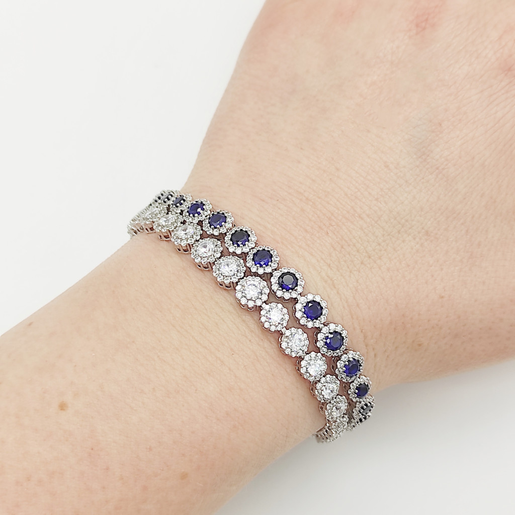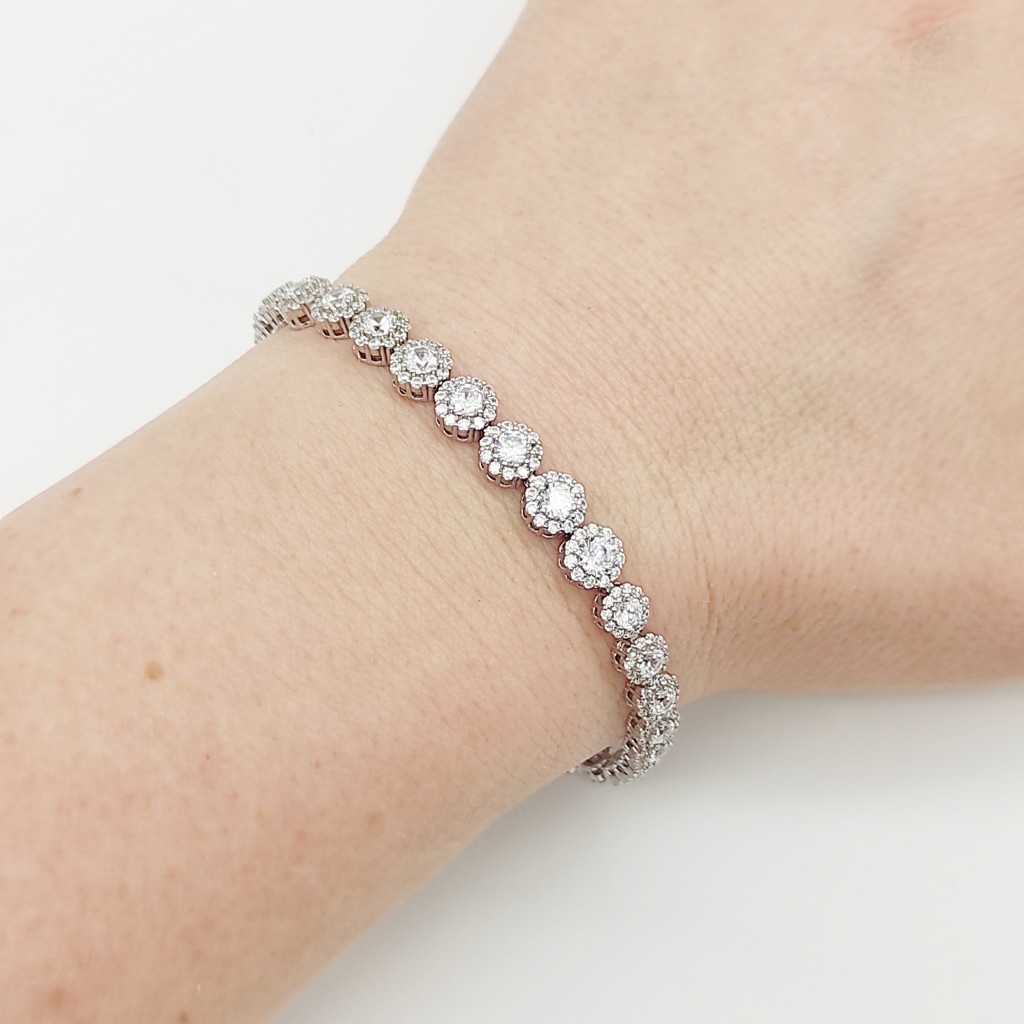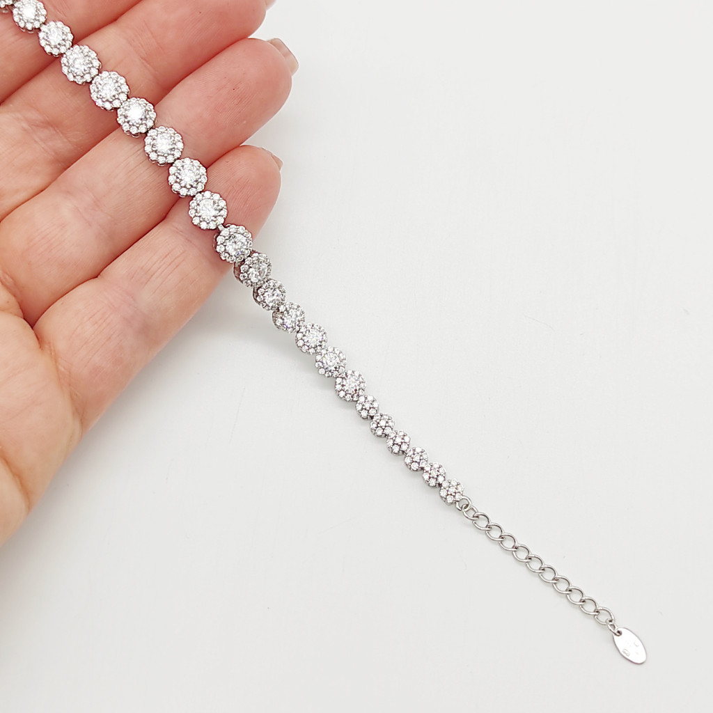 Ezüst virágmintás karlánc fehér kövekkel