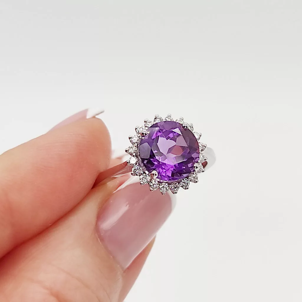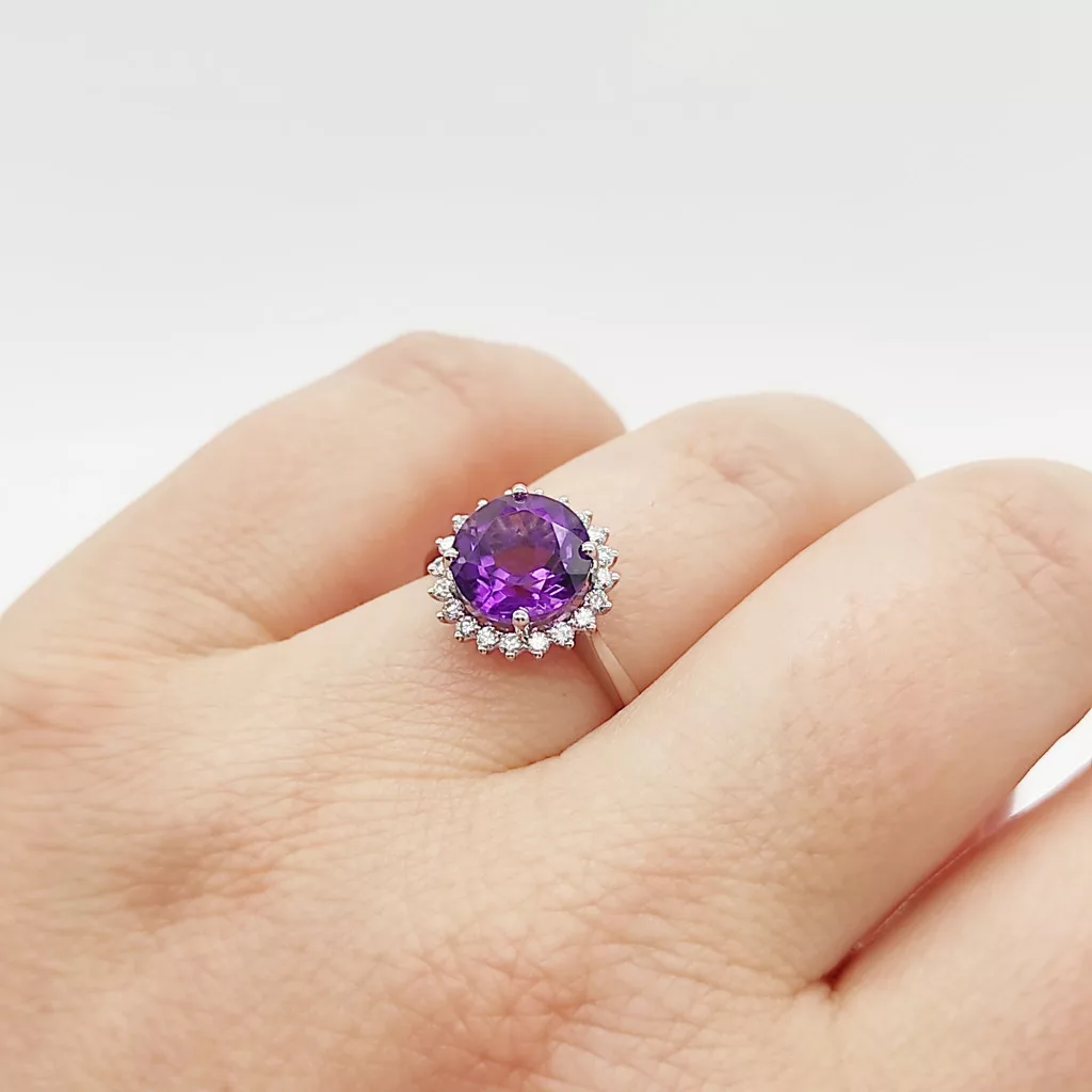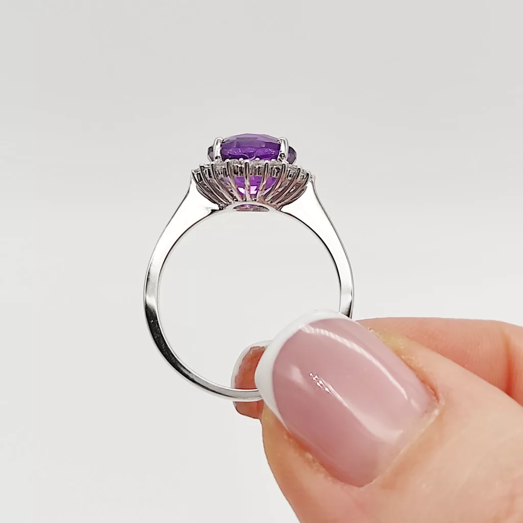 Fehér arany gyűrű gyémánttal és ametiszttel