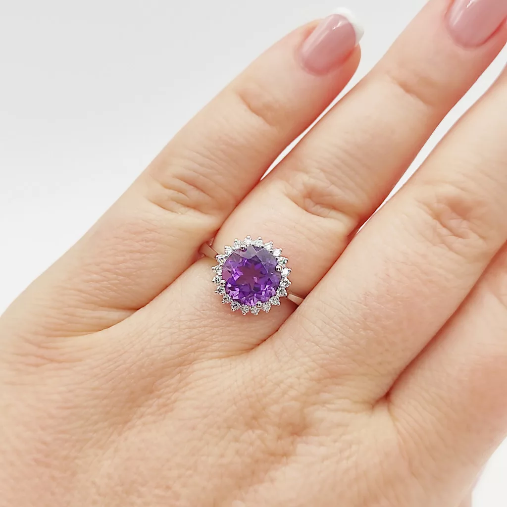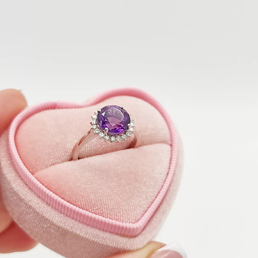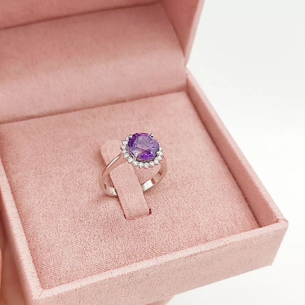 Fehér arany gyűrű gyémánttal és ametiszttel