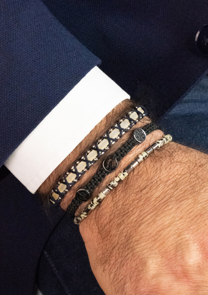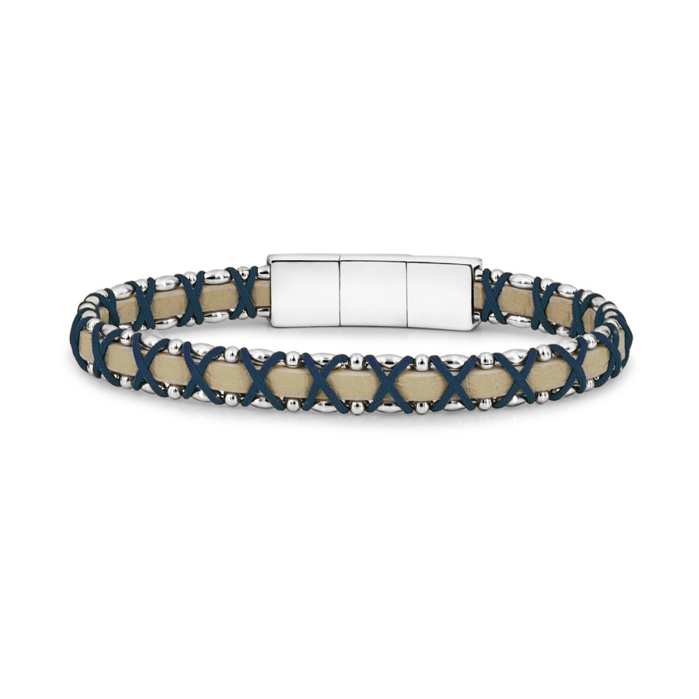 A DROMON Cream.AB karkötő krémszínű valódi olasz bőrből készült, kézzel készített acélgyöngyökkel és kék színű kötéllel kombinálva, a rozsdamentes acél csat pedig tökéletesen kiegészíti ezt a kifinomult, stílusos dizájnt.